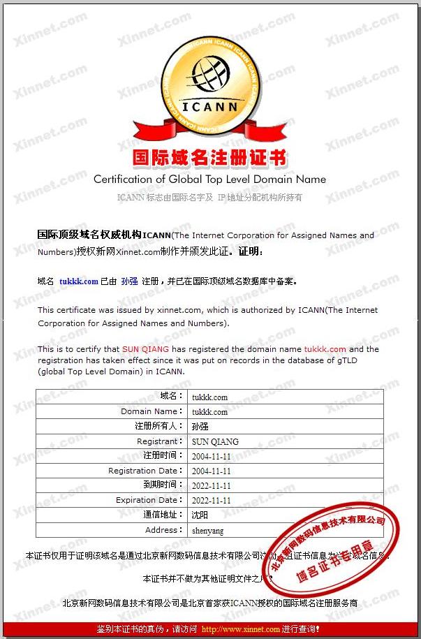 國際頂級域名權(quán)威機構(gòu)ICANN 頒布的tukkk.com國際頂級域名證書